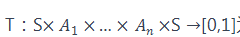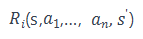 为球员i 的奖励函数。随机博弈中的转移函数是给定参与者当前状态和联合动作的下一个状态的概率分布。奖励函数