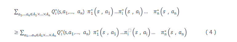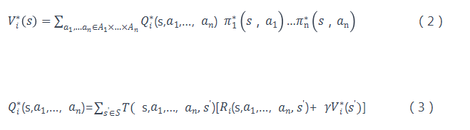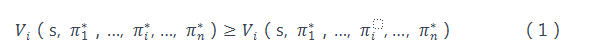 对于一个多人随机博弈问题,如果知道博弈中的奖励函数和转移函数,就可以找到博弈中的纳什均衡。随机博弈中的纳什均衡可以描述为一个包括n个策略的元组