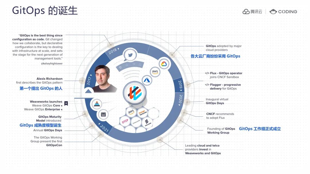 到了 2020 年,为了进一步推广 GitOps 理念和实践,云原生计算基金会(CNCF)宣布成立了 GitOps 工作组。这个工作组由多家云服务提供商和软件公司组成,他们一起制定了一套标准化的 GitOps 最佳实践和原则。