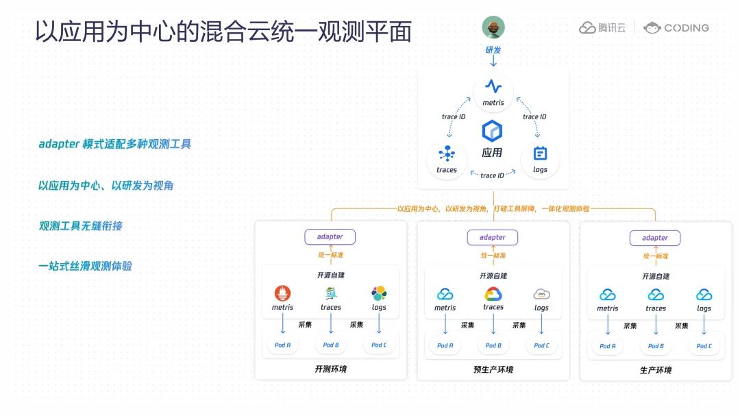 adapter 模式屏蔽了观测工具的复杂性,在此基础上,我们重新设计观测界面,并全部内置到应用的环境内,再结合应用模型,最终为用户呈现出以应用为中心,以研发为视角的观测产品,无是开源和云混合使用的场景,还是多云多环境场景,对于研发来说,均是在同一个应用中浏览,无需再切来切去费时费力,解决工具孤岛问题,同时,观测产品所呈现出来的数据是以应用为中心的,也就是说,在这个应用内,通常仅可以看到当前应用内的观测数据,解决视角割裂问题。
