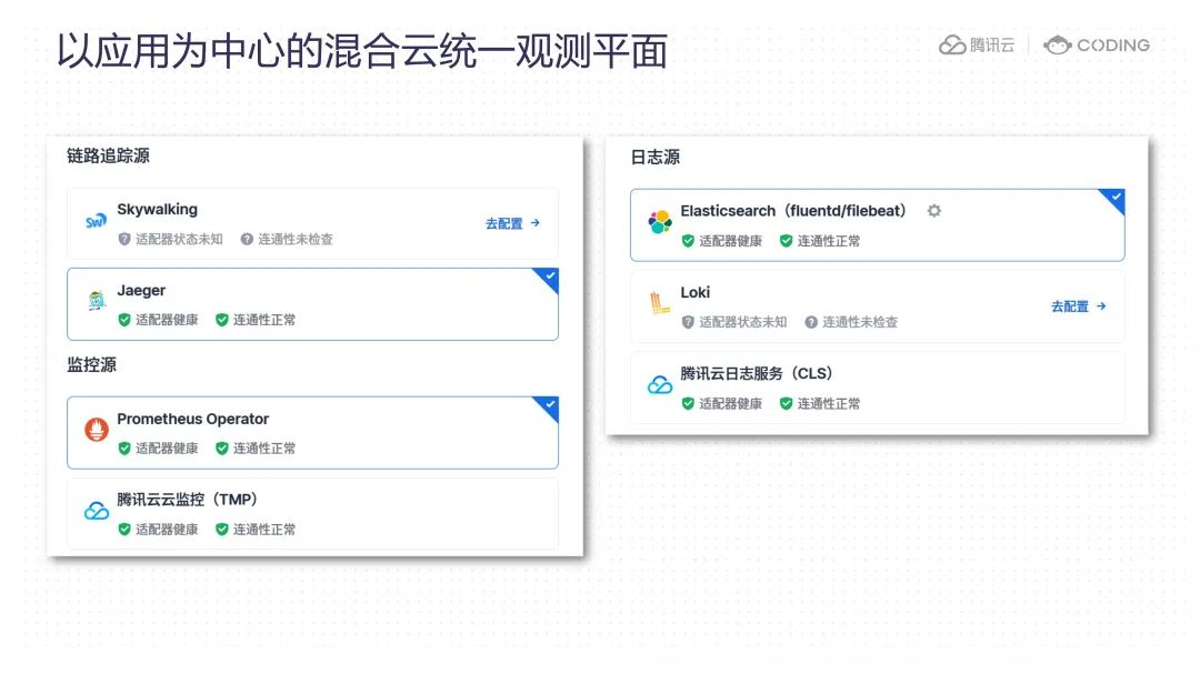 目前 Orbit 开源生态兼容上,支持 Prometheus、Loki、EFK、Skywalking、Jaeger 等主流开源观测产品,同时,为了保证用户在生产环境上观测工具的可靠性,我们也对接了腾讯云云监控、应用性能观测和日志服务产品,为生产环境保驾护航。
