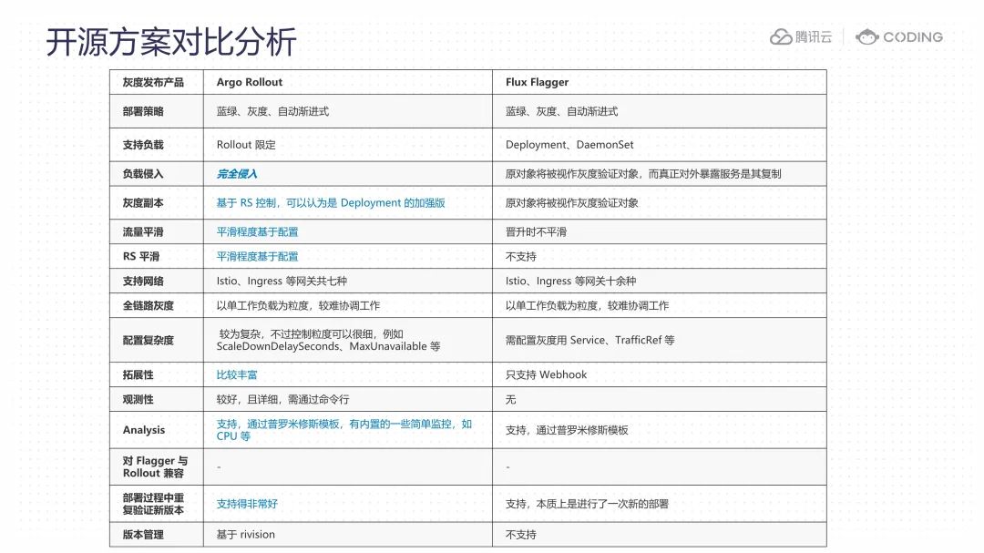 如图所示的表格,是对 Argo Rollouts 和 Flux Flagger 做的简要对比分析。比如在负载侵入的角度上,Rollouts 属于完全侵入,而 Flagger 中的原对象将被视作灰度验证对象,而真正对外暴露服务是其复制。比如关于部署过程中是否可以重复验证新版本,Argo 支持得非常好,而 Flux 虽然也支持,不过本质上是进行了一次新的部署。两者在其他层面上的能力也各有不同。