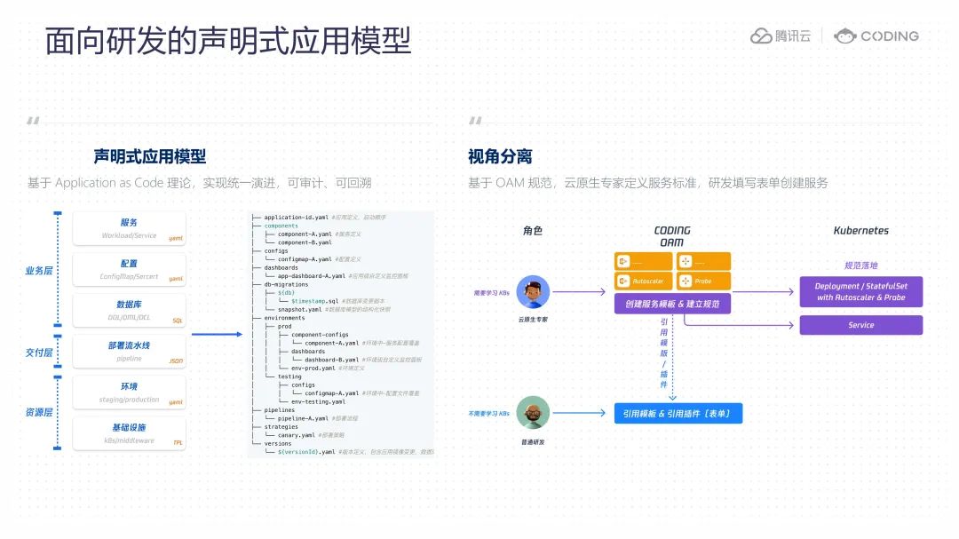 除此之外,我们基于 OAM 规范提供了视角分离的解决方案,企业内少部分云原生专家通过服务模板去封装 k8s 的规范,通过运维插件去封装 k8s 生态的扩展能力,比如说资源限制、探针等 k8s 原生能力,或者是监控、链路追踪等 k8s 生态能力,云原生专家可以根据实际情况,规定生产环境必须开启资源限制、探针、监控等运维插件,落地云原生规范,研发同学基于服务模板和运维插件以可视化表单的方式填写业务参数即可完成服务的创建,大幅降低云原生复杂性左移对研发的影响。
