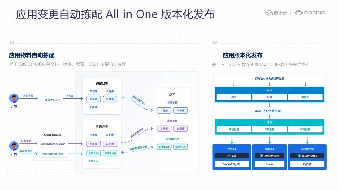 面对应用发布效率和可靠性的挑战,Orbit 的解决方法是 GitOps 自动拣配引擎和 All In One 版本化发布,开发者只需要专注自己负责的代码、配置和 SQL 脚本,Orbit 的 GitOps 自动拣配引擎会持续监听应用制品库和代码仓库,自动拣配镜像、配置、SQL 变更。