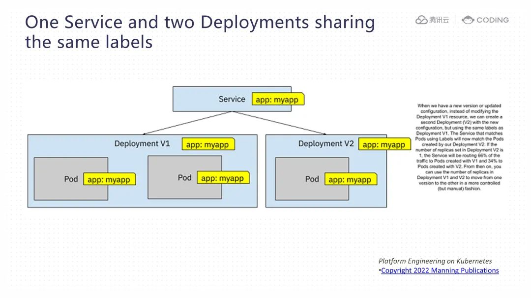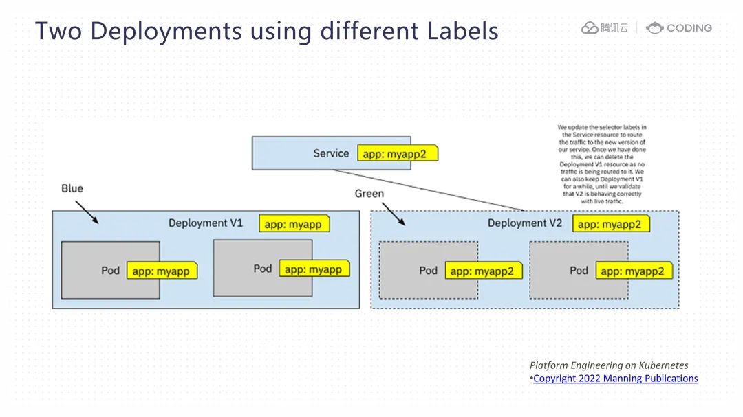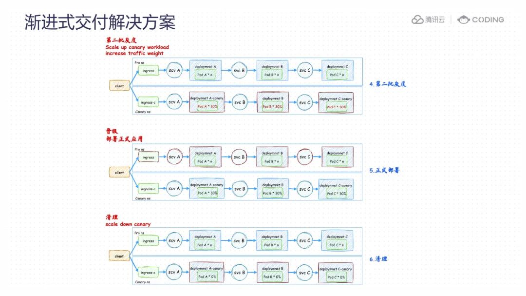 不同于传统的蓝绿部署方式,这一过程并不是一次性切换所有流量,而是在两轮灰度验证成功之后,再对原生产环境进行晋级。这种设计的理念在于,传统的蓝绿部署方式在多次切换之后,由于每次生产环境都被切换到新的命名空间,可能会导致混淆,使我们难以确定用于生产环境的命名空间是哪一个。而通过固定对 "production" 命名空间进行持续晋级,我们可以确保这个命名空间一直被用于生产环境,而其他命名空间被专用于进行灰度测试,避免了混淆带来的潜在风险。