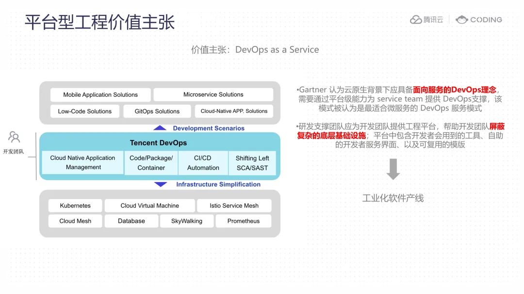 权威机构 Gartner 认为,在云原生环境下,我们需要建立面向服务的 DevOps 理念,通过平台级能力为服务团队提供 DevOps 的支持。这种模式被认为是最适合微服务的 DevOps 服务模式,其核心价值主张就是“DevOps as a Service”。