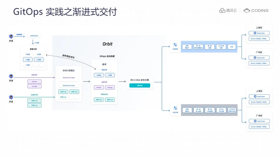 在基于 Orbit 实践 GitOps 渐进式交付的流程中,开发人员需要将他们负责的代码、配置和 SQL 脚本等变更提交到代码仓库。业务代码的提交会触发持续集成(CI)流程,该过程将构建新的应用镜像,并将其存储在镜像仓库中。