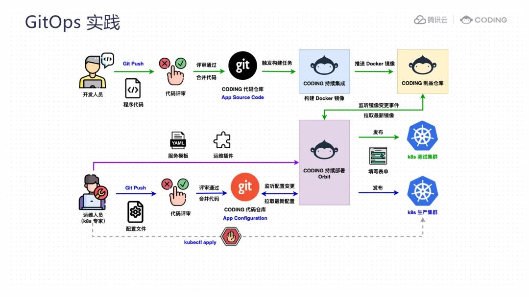 对于运维人员,他们无法像以前那样直接使用 kubectl apply 命令来操作 Kubernetes 集群。他们需要通过在 CODING 代码仓库中提交更新的配置文件来修改配置。当这些配置文件通过审查并被合并到主分支后,CODING 的持续部署模块会检测到这些配置文件的变化,并触发相应的持续部署流水线,将新的配置发布到 Kubernetes 集群。