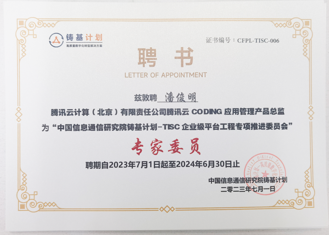为肯定各参编单位为标准研制做出的积极贡献 ,同时进一步推动平台工程技术高质量发展,信通院在今天的数字生态发展大会上启动成立平台工程专家委员会并颁发荣誉表彰。腾讯云 CODING 被评为 TISC 企业级平台工程综合能力要求标准贡献单位,腾讯云 CODING 应用管理产品总监潘俊明被聘为“中国信息通信研究院铸基计划 - TISC 企业级平台工程专项推进委员会”专家委员。