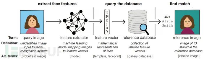 • 人脸识别与面部验证:要注意人脸识别和面部验证(Face Verification)是有区别的。面部验证广泛应用于验证移动设备上的用户,例如 iPhone 上的 Face ID。它通过将用户的面部特征与授权用户存储的面部特征进行比较来进行验证。虽然这两个系统使用了类似的技术来分析面部图像,但面部验证系统需要用户明确同意才能部署,而许多人脸识别系统在未经用户同意的情况下运行。因此,大多数反识别工具并不针对面部验证系统。此外,面部验证系统可以被看作是人脸识别系统的一种特例,其中参考数据库只包含一个用户的特定面部信息。人脸识别系统的识别流程如下所示: