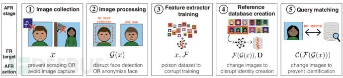 针对人脸识别不同工作阶段,反识别工具所使用的针对性防御策略如下: