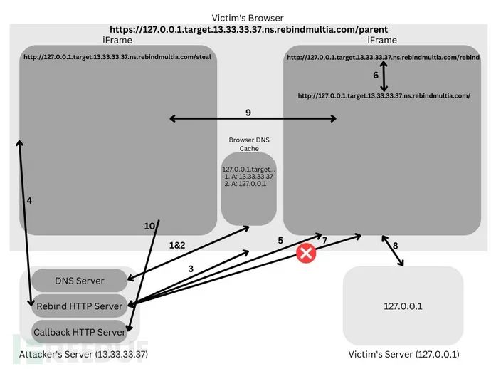 (向右滑动,查看更多)接下来,目标浏览器将连接到第一个IP,并开始与攻击者的第一个恶意HTTP服务器进行交互。此服务器将以包含两个iframe的页面作为响应,一个指向/steak,另一个指向/rebind。/steake iframe将加载一个恶意页面,以访问第二个iframe并获取内容。/rebind端点在被击中时,将发出302重定向到/并终止第一个恶意HTTP服务器的运行。因此,当浏览器返回到攻击者的HTTP服务器时,它将遇到一个关闭的端口。因此,它将回退到第二个IP。一旦目标内容被加载到第二个iframe中,第一个ifame就可以访问它,窃取数据,并将其过滤到攻击者的第二个恶意HTTP服务器——回调服务器。