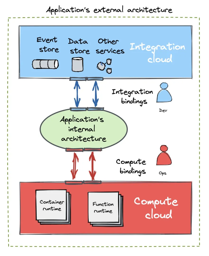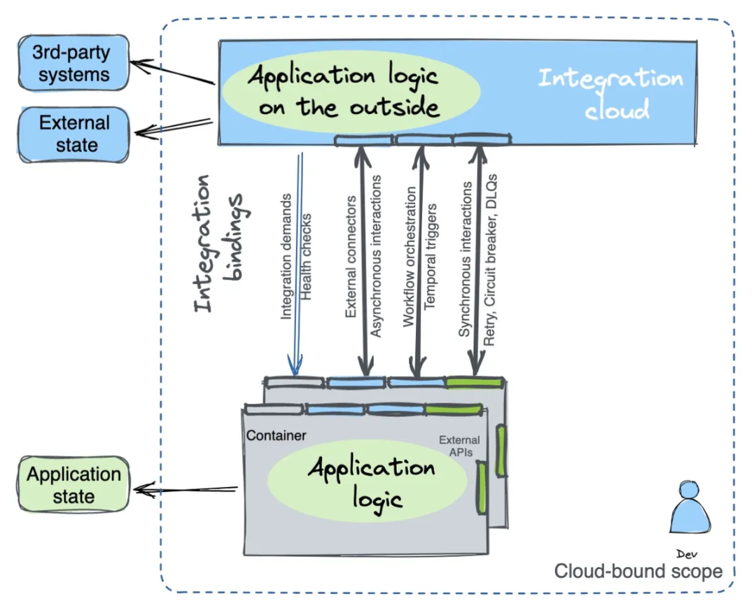 随着对应用为先的云服务采用愈发广泛,应用与云服务的融合程度也到了前所未有的深度。应用程序和云运行时的边界从虚拟机转移到了容器和函数中。集成边界从仅使用数据库和消息代理访问,转换成应用程序的机械部分在云中的混合运行。在这些因素影响下的架构中,应用程序与“云绑定”,应用逻辑与管理责任转移至云服务中,允许开发者专注于业务逻辑。