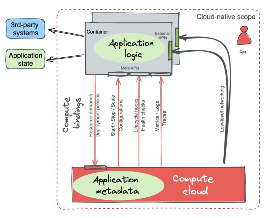 从理论上来说,所有应用程序对运维团队而言都是需要在计算平台上操作的黑盒单元。计算绑定是用于管理应用在 Kubernetes、AWS Lambda 及其他服务平台上的生命周期。这类绑定均是规范化,以配置集合加上应用与其所运行的平台间交互的 API 的形式进行定义。多数交互都是对应用透明的,只有少数 API 需要开发者自行实施,如健康端点和指标 API。这是目前 CNCF 对此的定义,也是“云原生”概念所囊括的范围,开发者只需实现云原生应用,就能将其绑定在云计算平台上运行。