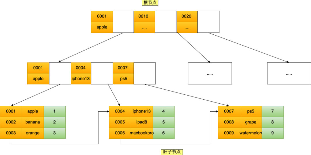 联合索引(product_no, name) 的 B+Tree 示意图如下(图中叶子节点之间我画了单向链表,但是实际上是双向链表,原图我找不到了,修改不了,偷个懒我不重画了,大家脑补成双向链表就行)。
