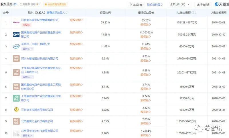 根据紫光展锐目前最新的股权结构来看,第一大股东为紫光集团间接控股的北京紫光展讯投资管理有限公司,持股35.23%;国家大基金一期为第二大股东,持股13.98%;英特尔为第三大股东,持股11.87%;第四大股东为碧桂园创投,持股5.53%;第五大股东为上海盛迎映展,持股4.98%;第六大股东为国家大基金二期,持股3.74%。