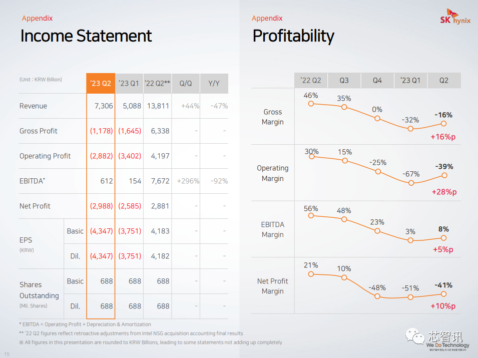 SK 海力士第二季度营收为 7.3059 万亿韩元,环比增长 44%,同比下滑 47%;营业亏损额达 2.8821 万亿韩元,环比增长 15%,同比由盈转亏;净亏损额达 2.9879 万亿韩元,环比下滑 16%,同比由盈转亏(去年同期为盈利4.3万亿韩元)。2023 财年第二季度营业亏损率为 39%,净亏损率为 41%。单季接近3万亿韩元(约合人民币168亿元)的净亏损,超出了分析师预期的2.7万亿韩元净亏损。