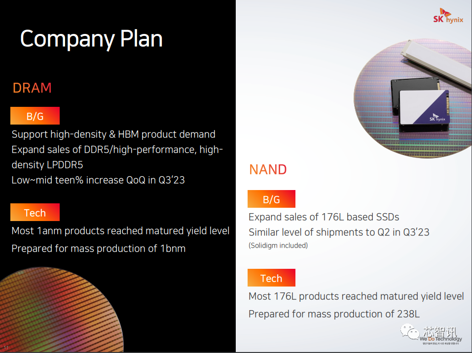 相比之下,SK 海力士将下半年的发力重点放到了更具增长潜力的高端DRAM和更高堆叠层数的NAND产品上。SK海力士计划在三季度扩大 HBM3、高性能 DDR5 和 LPDDR5 DRAM 等用于 AI 服务器的内存产品的销售,预计相比二季度增长10%-15%。同时,下半年还计划扩大基于 176 层 NAND Flash的 SSD产品的销售,并准备批量生产238层的NAND Flash,从而加速改善下半年业绩。