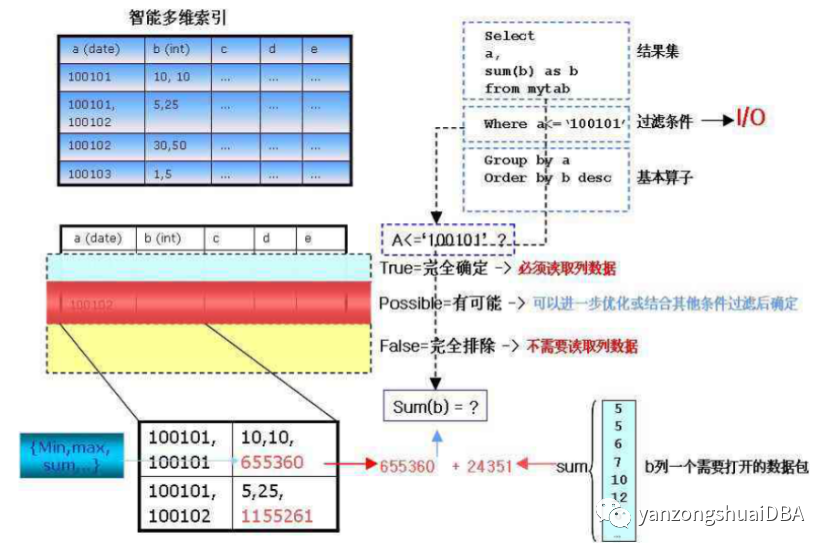 不管怎么说,刨除带group by外,从上述原理上可以看出,过滤操作可以通过每个DP包的统计信息快速筛选出满足条件的DP包,强相关的DP包仅从它的统计信息中就可以得到聚合值,无需再解压DP包并进行扫描计算,无关DP包就可以直接跳过。大大降低了计算过程及IO。