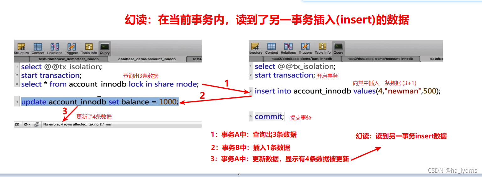 例如事务T1对⼀个表中所有的⾏的某个数据项做了从“1”修改为“2”的操作,这时事务T2⼜对这个表中插入了⼀⾏数据项,⽽这个数据项的数值还是为“1”并且提交给数据库。⽽操作事务T1的⽤户如果再查看刚刚修改的数据,会发现还有⼀⾏没有修改,其实这⾏是从事务T2中添加的,就好像产⽣幻觉⼀样,这就是发⽣了幻读。幻读主要是针对insert与delete。