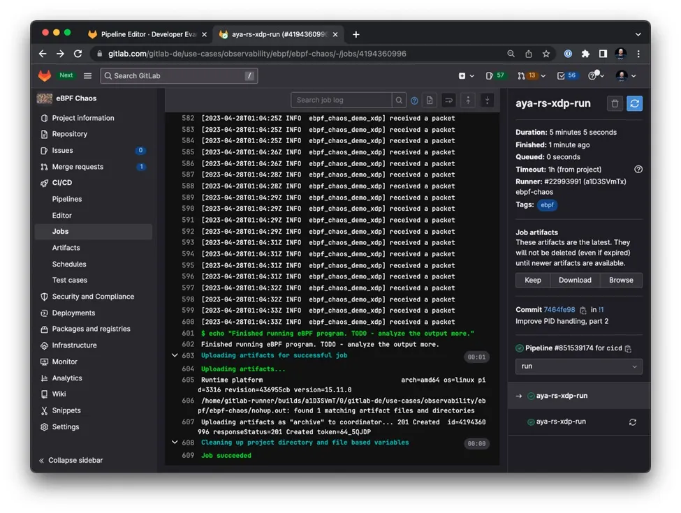 llvm-objdump -S target/bpfel-unknown-none/debug/ebpf-chaos-demo-xdp完整的源代码位于该 GitLab 项目中,可以使用 GitLab CI/CD 流水线进行测试。注意,它需要在 runner 环境中安装 Rust 工具链。随后的流水线运行将会使用配置好的缓存。该流水线有三个 job: