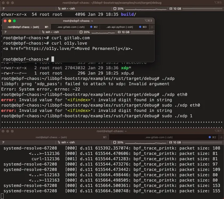另外,基于我的研究过程,推荐 libbpf 库,因为它的 bootstrap 项目提供了更多的演示应用。它们提供了真实的程序,可以用来实现自己的第一个 eBPF 程序。其中有一个样例是使用 Rust 编写的,允许我们按照 XDP 规范检查网络流量以及数据包的大小。eXpress Data Path(XDP)允许在大规模网络调用时挂钩发送 / 接收的网络数据包,这会发生在中断之后和内存分配之前。例如,这可以用来悄悄地丢弃数据包(请注意后面高级的 eBPF 程序开发用例)。