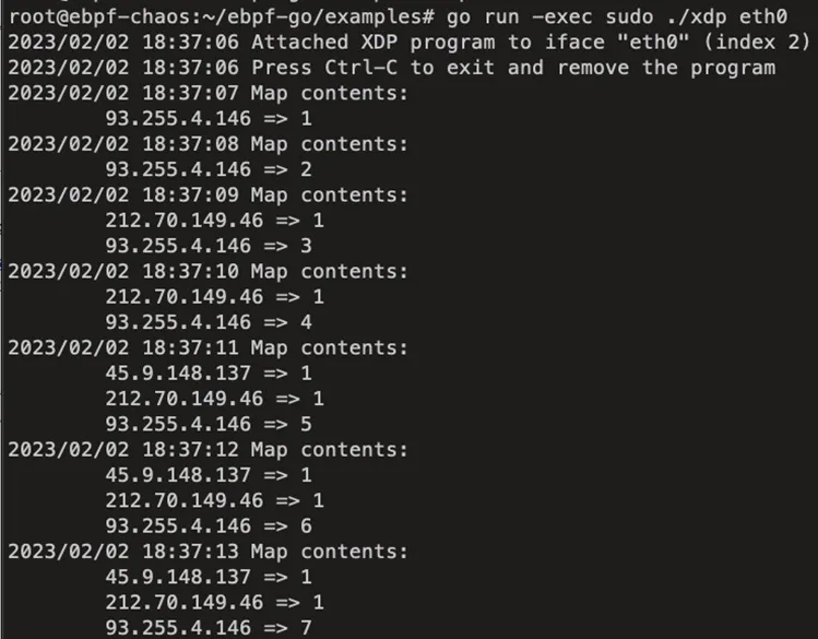 $ RUST_LOG=info cargo xtask run样例程序没有跟踪 IP 地址及其数据包的数量,但是这可以作为一个很好的练习,模仿 Go 库样例中的行为。