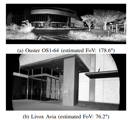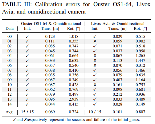 表格III总结了全景相机的校准结果,尽管对于Ouster LiDAR,全景相机显示出良好的初始猜测成功率和低校准误差,但对于Livox LiDAR和全景相机的组合,初始猜测估计和精细LiDAR-相机配准的效果都有所降低。这是因为由于LiDAR和相机的视场(FoV)差异非常大,只使用了全景相机图像的一小部分进行校准,并且图像的分辨率不足以表示有限的FoV下的精细环境细节,我们认为通过使用更高分辨率或多个图像可以提高校准精度。