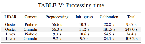 表格V显示了每个标定步骤的处理时间,根据LiDAR和相机模型的组合,从15个数据对中校准LiDAR相机转换所需的时间介于74到249秒之间,虽然Ouster LiDAR和全景相机的组合需要更长的时间,因为这两个传感器都具有360°的视场,并且需要投影大部分点云,但我们认为这在离线标定中是合理的水平。