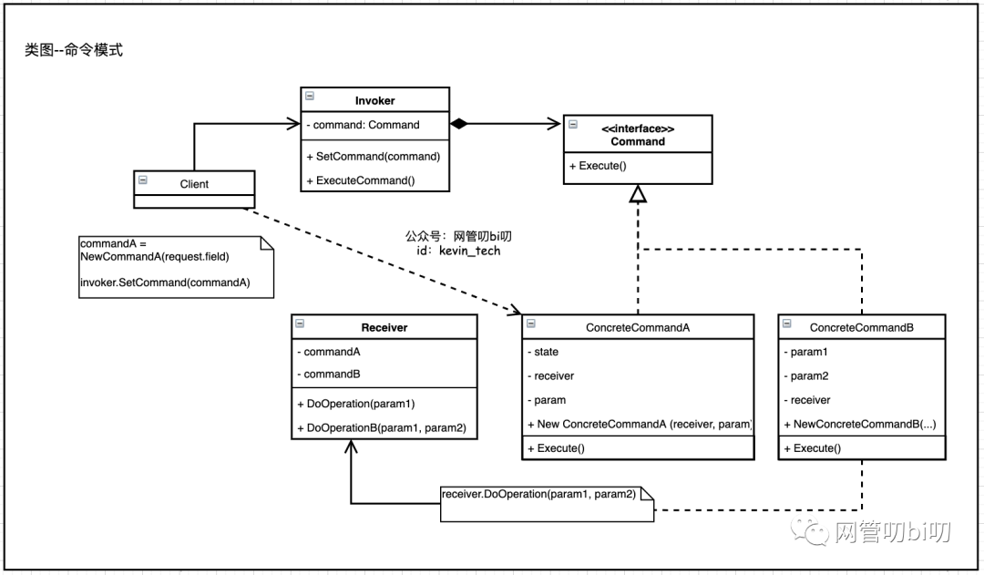 直接这么描述听起来比较抽象,下面我们结合UML类图详细看一下命令模式内部这几种基础组件的特性和具有的行为。