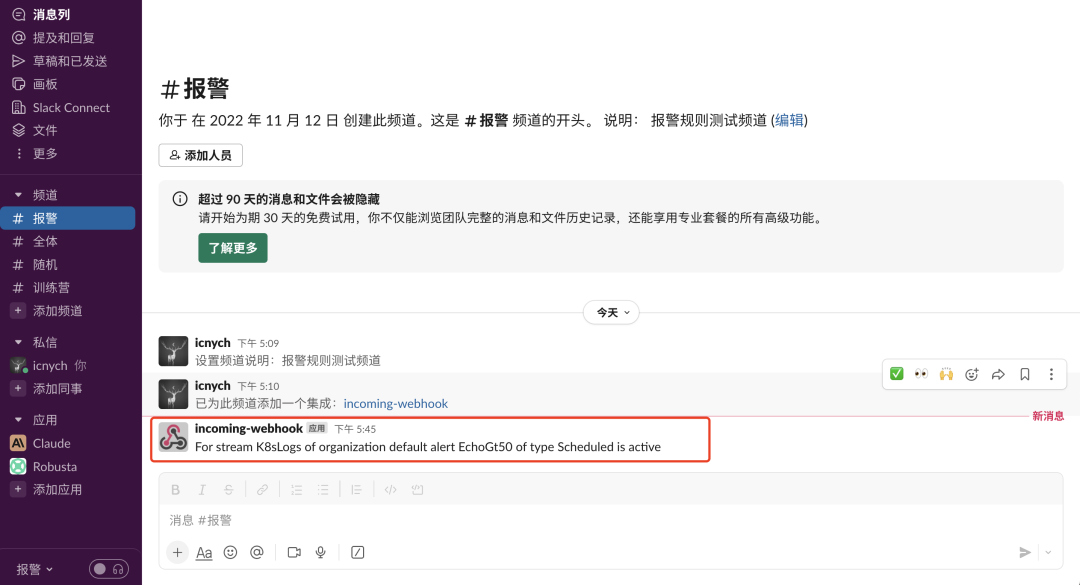 这里我们添加了一个计划报警,当 K8sLogs 日志流在 1 分钟内的日志数量大于 50 条时就会触发报警,然后发送到 Slack 目的地中,需要注意的是这里查询语句最终会加上时间范围进行过滤,比如我们这里的查询语句在执行的时候实际执行的语句如下所示: