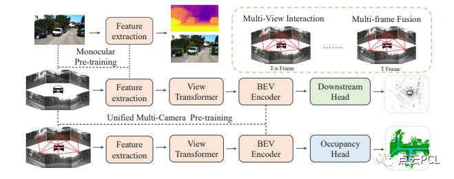 将2D图像转换为3D空间的学习方法主要有两种:基于LSS的视角转换和基于Transformer的视角转换,我们的方法不局限于特定的视角转换方法。这里概述基于鸟瞰图的多摄像头感知算法的工作流程。多摄像头输入图像表示为I = {Ii,i = 1, 2, ..., N},首先通过图像主干网络(例如ResNet-101)进行处理,为每个摄像头视图生成特征图F,然后,将这些特征输入到2D到3D视角转换操作中,将它们投影到统一的鸟瞰图表示中,表示为Fbev ,通过结合特定的任务头,可以在鸟瞰图上完成各种自动驾驶感知任务,包括3D物体检测、地图分割、物体跟踪等。目前的BEV感知算法主要依赖于在单目图像上训练的特征提取模型(例如ImageNet)或深度估计模型(例如V2-99 ),然而,这些方法未考虑来自不同摄像头视图和帧的图像之间的相互作用和相关性,因此,缺乏一个多摄像头统一预训练模型,为了充分利用不同摄像头视图之间的空间和时间关系,我们提出了一个多摄像头统一预训练模型。诸如BEVDepth 和DD3D等方法展示了深度估计对基于视觉的感知算法的重要性,然而,深度估计只能估计物体表面的位置,忽略了物体的遮挡情况,对于多摄像头系统来说,精确的3D占据栅格预测有助于提高感知的准确性。