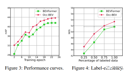 在图3中展示了BEVFormer的收敛曲线,我们的统一预训练在初始时期显著提升了BEVFormer,NDS增加了4%。这表明我们的统一预训练方法能够从全局角度提供准确的目标位置信息,对于基于LSS的方法BEVDet和BEVDepth,它们在ImageNet上进行了monocular预训练,我们的多相机统一预训练方法在NDS和mAP上分别改进了约2.0%。
