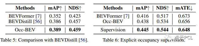 为了进一步验证,我们在nuScenes的测试集上进行了额外的实验证明了我们提出的基于三维场景重建的多相机统一预训练方法相较于基于monocular深度估计的预训练方法的有效性。如表2所示,与在DD3D上进行深度估计预训练的DETR3D 相比,我们的多相机统一预训练方法在mAP和NDS上都显著提高了约1.8%。这凸显了我们的预训练方法在提升三维感知任务性能方面的有效性和优越性。以上结果表明,我们提出的Occ-BEV模型在自动驾驶领域具有良好的应用前景。我们还将我们提出的多相机统一预训练方法与知识蒸馏方法BEVDistill 进行了比较。如表5所示,我们的方法表现与基于标注的LiDAR点云数据进行训练的知识蒸馏方法相当,值得注意的是,我们的方法更高效且具有更广泛的适用性,因为它不依赖于数据注释或LiDAR点云模型的训练,而BEVDistill 则依赖于这些。