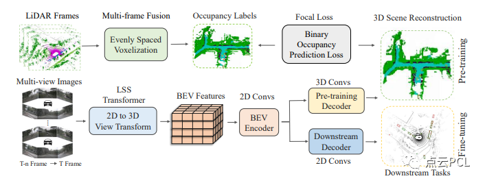 图2:所提出的多摄像头统一预训练方法Occ-BEV的总体架构,首先将多帧大规模非规则LiDAR点云转换为体积表示,作为几何占用标签,然后在BEV编码器中添加一个具有几层3D卷积的占用解码器。将二进制占用分类作为预文本任务,用于区分体素是否包含点云,在预训练之后,轻量级解码器被丢弃,编码器用于预热下游任务的主干网络。