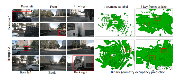 如图5展示了几个重建的三维场景,可以观察到使用单帧点云作为占据格生成的监督信息会导致不完整的重建,因为LiDAR点云的稀疏性。另一方面,使用三个关键帧及其对应的非关键帧作为监督信息可以更完整地重建三维场景。