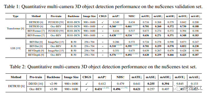 在nuScenes数据集上进行了大量实验。我们采用了现有方法DETR3D和BEVFormer(基于Transformer的方法),以及BEVDet、BEVDepth和BEVStereo(基于LSS的方法)的训练设置。对于DETR3D和BEVFormer,将体素大小设置为16×200×200;对于BEVDet、BEVDepth和BEVStereo,将体素大小设置为16×128×128,我们总共进行了24个时期的预训练,占用解码器包括两层3D卷积层,所有实验均使用了8张Nvidia Tesla A40 GPU卡进行。