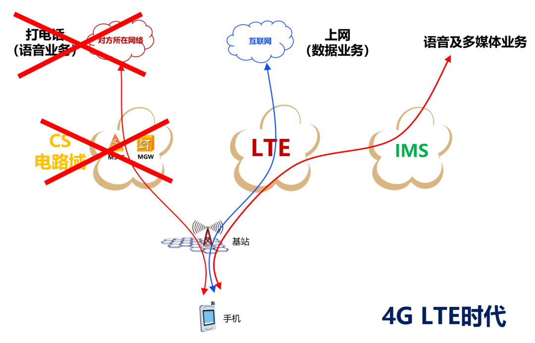 然后,像语音通话这样的业务,就交给“LTE(分组交换)+IMS”配合实现。这个业务,就是大名鼎鼎的VoLTE(Voice over LTE,基于4G的语音通话)。