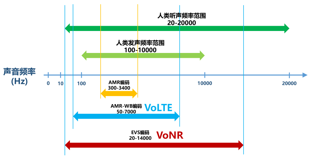 VoNR可以采用EVS(Enhance Voice Services)编解码,具有更强的抗丢帧、抗延时、抗抖动和高保真能力,声音传输带宽由50Hz-7000Hz扩展到了20Hz-14000Hz,达到高保真耳机的音质水平。