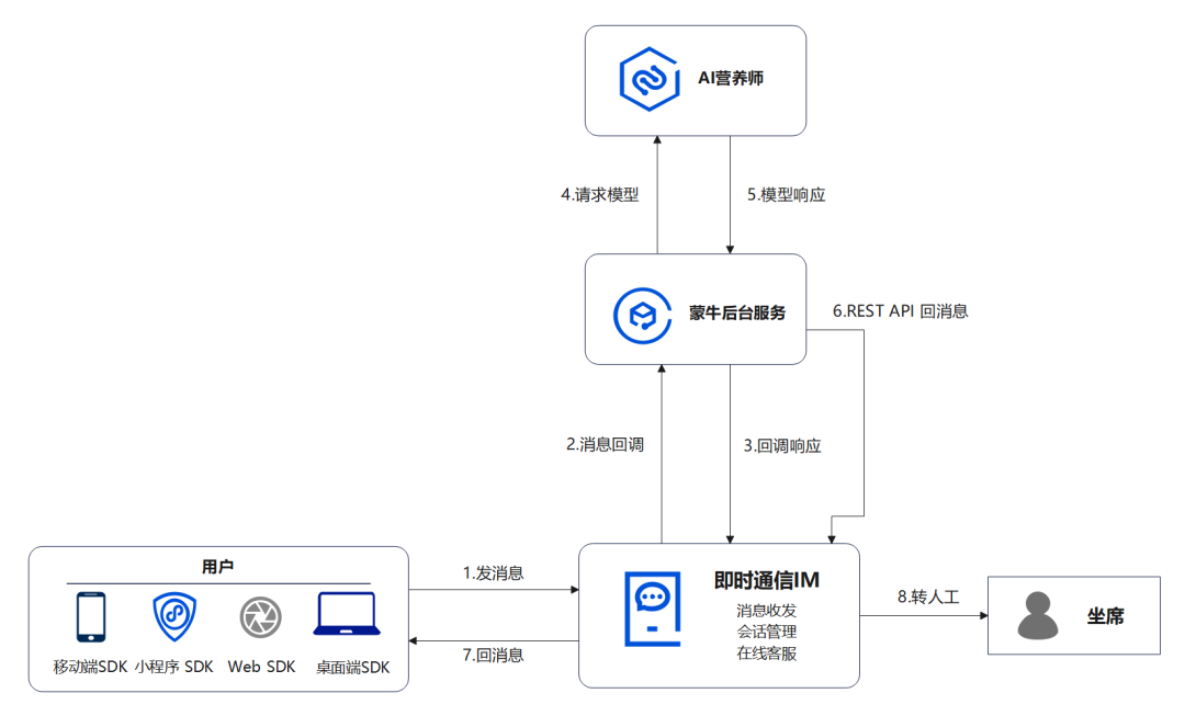 客服侧:服务端通过异步消息及会话保持机制,连通客户AI模型,并融合云联络中心TCCC底层技术,提供人工坐席能力。