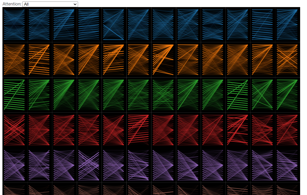 👉单击任何单元格以查看相关注意力头的注意力详细视图(或取消选择该单元格)。