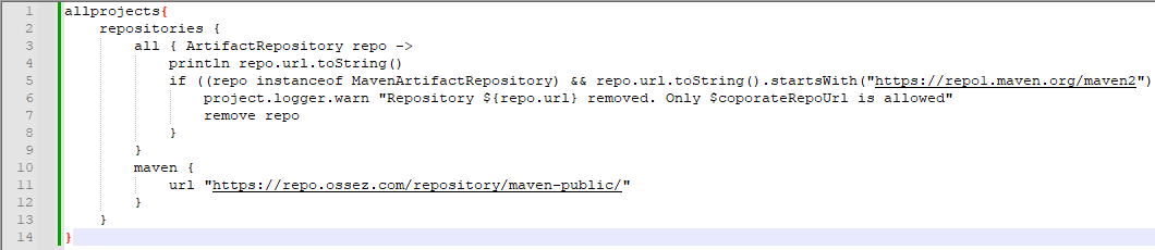 project.logger.warn "Repository ${repo.url} removed. Only $coporateRepoUrl is allowed"