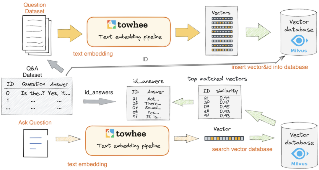 简单来说,数据分成了两部分,一部分是 Question Dataset,另一部分是 Ask Question。然后通过 Text embedding 的方式生成 Vector,并将其写入 Milvus。在实际查询的过程中,把用户的查询通过相同的算子将其生成一个向量,再通过向量查询 Vector database,最终拿到一组相似的 ID,这些 ID 通过反查得到更多的信息。随后可以运行一个精排模型,比如利用 ChatGPT + prompt 的方式进行查询结果的归纳/总结。