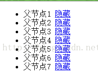 < ul id= "ul1" > < li > 父节点1 < a href= "javascript:;" > 隐藏 </ a ></ li > < li > 父节点2 < a href= "javascript:;" > 隐藏 </ a ></ li > < li > 父节点3 < a href= "javascript:;" > 隐藏 </ a ></ li > < li > 父节点4 < a href= "javascript:;" > 隐藏 </ a ></ li > < li > 父节点5 < a href= "javascript:;" > 隐藏 </ a ></ li > < li > 父节点6 < a href= "javascript:;" > 隐藏 </ a ></ li > < li > 父节点7 < a href= "javascript:;" > 隐藏 </ a ></ li > </ ul >