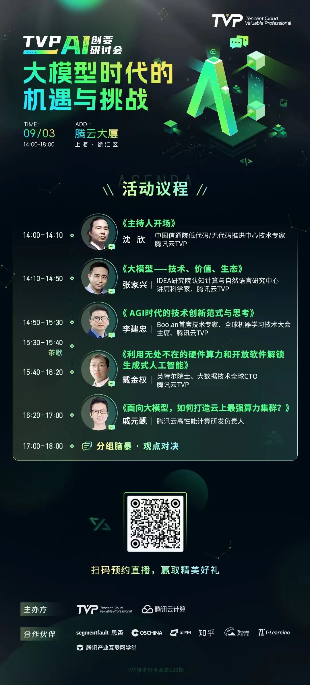 腾讯云 TVP AI 创变研讨会,是为 TVP 等技术管理者、AI 创业者打造的专属交流活动,旨在聚焦 AI 前沿,通过系列专题研讨,共同探索 AI 变革浪潮下的创业与创新机遇。希望通过本期「大模型时代的机遇与挑战」腾讯云 TVP AI 创变研讨会,携手顶级大咖,帮助与会者锚定赛道方向。