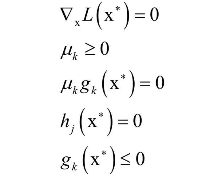 λ和μ称为KKT乘子。在最优解处x*应该满足如下条件: