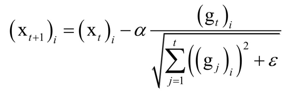 其中α是学习因子,gt是第t次迭代时参数的梯度向量,ε是一个很小的正数,为了避免除0操作,下标i表示向量的分量。和标准梯度下降法唯一不同的是多了分母中的这一项,它累积了到本次迭代为止梯度的历史值信息用于生成梯度下降的系数值。根据上式,历史导数值的绝对值越大分量学习率越小,反之越大。虽然实现了自适应学习率,但这种算法还是存在问题:需要人工设置一个全局的学习率α,随着时间的累积,上式中的分母会越来越大,导致学习率趋向于0,参数无法有效更新。