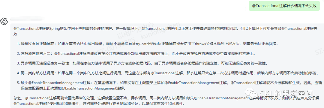 正常情况下,只要在类上添加@Transactional注解就完事了,那是什么原因导致注解失效了呢?问问ChatGPT吧,回复如下: