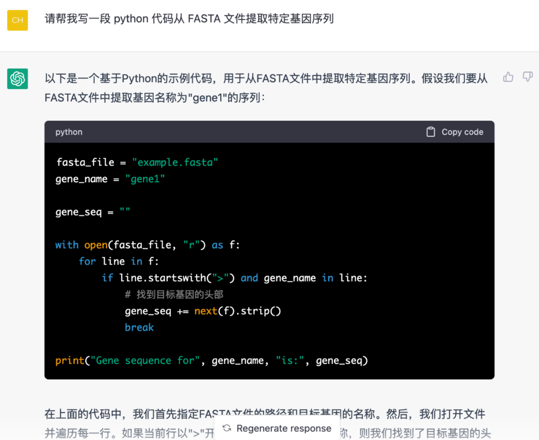 再问个问题,“请帮我写一段 python 代码从 FASTA 文件提取特定基因序列”。