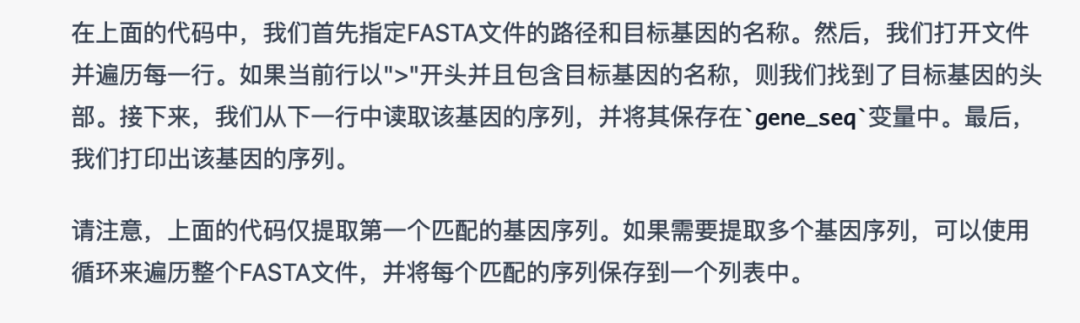 >判断 FATSA的名字行和判断基因名字是否存在; 拿到序列,存起来;结构上很赞,而且下面还附上了一部分代码解释、代码局限性分析和改进策略。一般初学者能独立写代码完成到这个程度,我认为可以说是程序已经入门了。